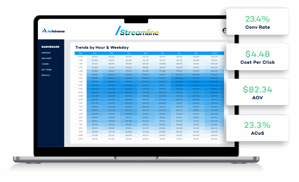 Our Pulse continuous bidding system harnesses hourly data from Amazon Marketing Stream to help place your ad when it will most likely lead to a sale. When it comes to reviewing metrics, advertisers are typically looking back seven or 30 days and adjusting accordingly. Most of your competition isn’t looking at day of week numbers, let alone hourly metrics. But we are. This inefficiency by the competition creates an opportunity for us. Using our propriety Ad Advance Pulse system, we can now make sure your ads are getting shown when people are most likely to purchase.