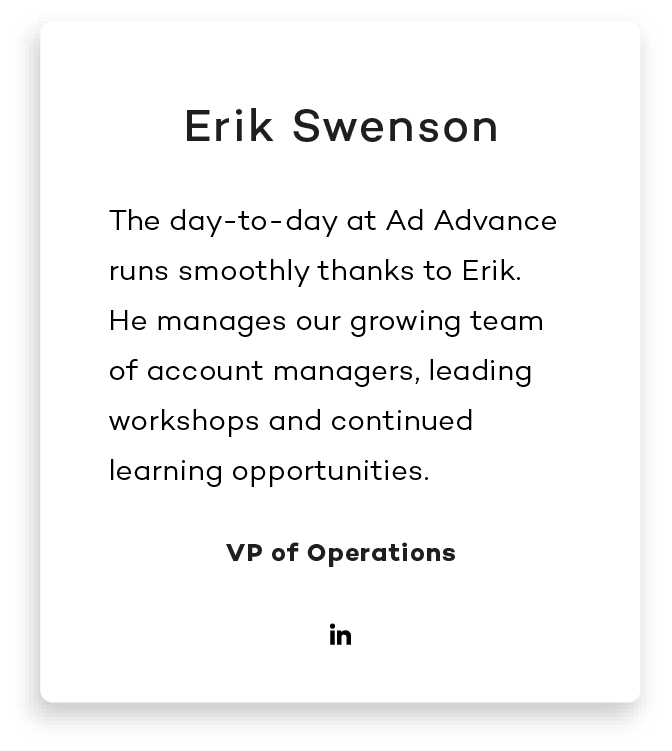 Our Business Development team at Ad Advance is focused on building meaningful, long-term partnerships through a data-driven, transparent approach. We take the time to deeply understand your brand’s needs, offering tailored strategies that prioritize growth and efficiency over quick wins. When you explore a partnership with us, you’ll experience a collaborative, consultative process where your success becomes our shared goal.